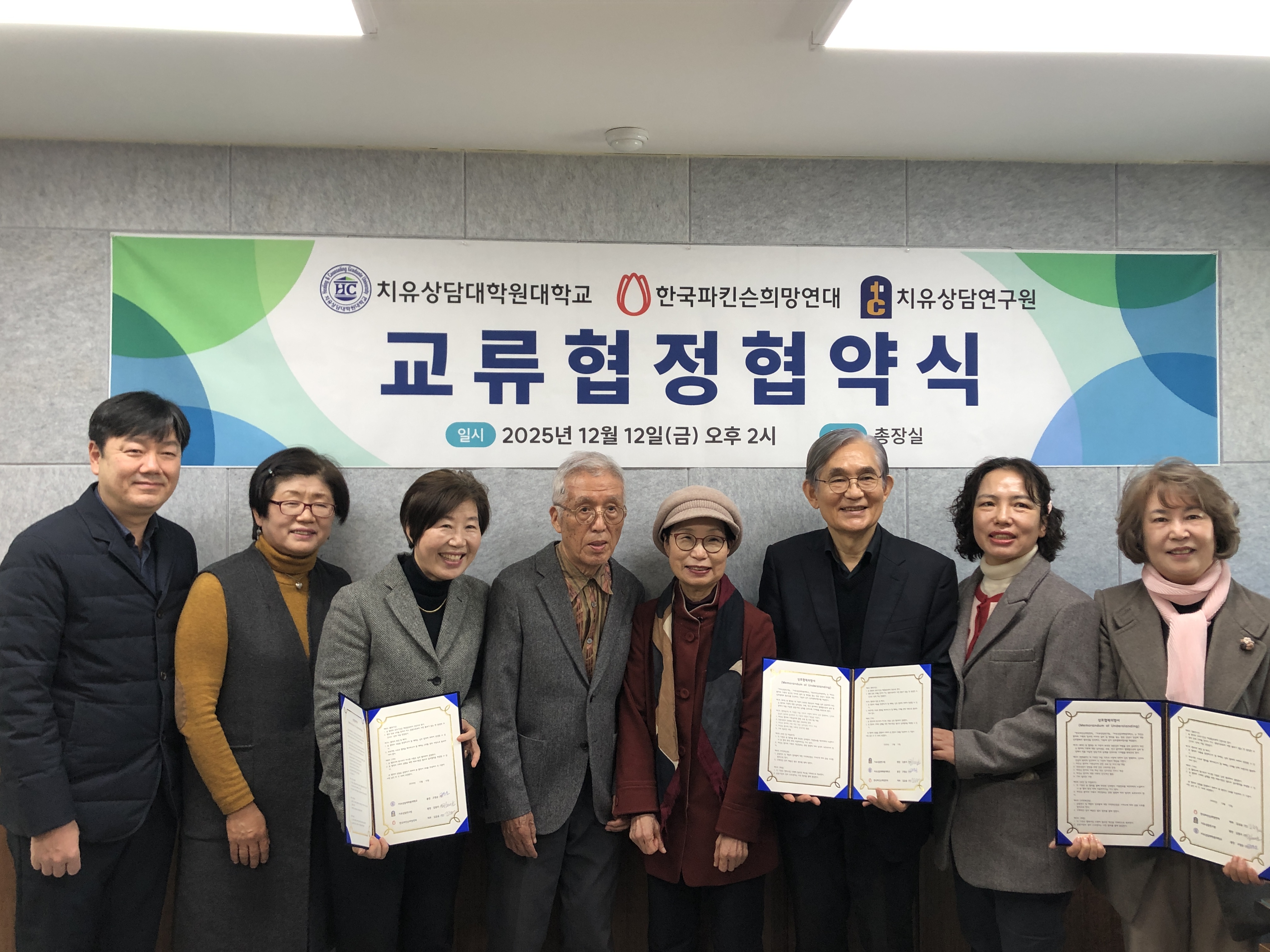 한국파파킨슨희망연대와 치유상담연구원 협약식, 2025. 12. 12(금) 오후2시참석: 김중호 원장, 채명숙 처장, 김금윤 회장 외 8명